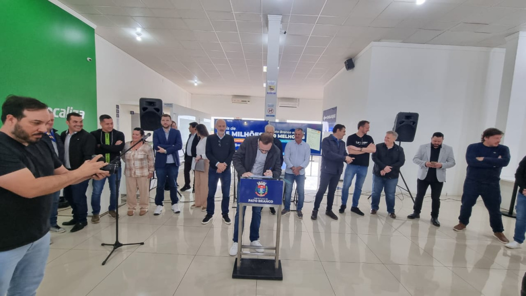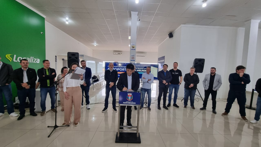 A cerimônia na quinta-feira, 04 de abril, marca o início do processo de licitação para o novo terminal de passageiros do Aeroporto Regional de Pato Branco. Com a presença de lideranças políticas e empresariais o Prefeito Robson Cantu assinou o termo que autoriza o início do processo de licitação. O processo dará seguimento as obras para adequações na infraestrutura da pista do aeroporto, para receber aeronaves maiores.