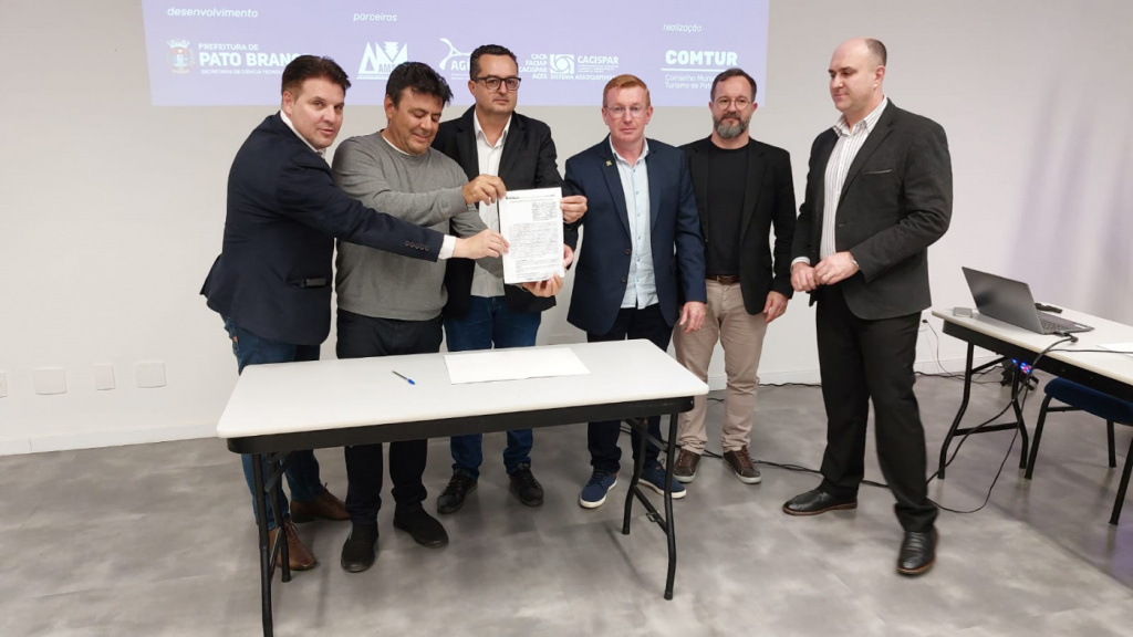 Nesta quinta-feira (6), foi realizada a assinatura dos termos de cooperação, em solenidade no auditório do Sebrae/PR, em Pato Branco. O prefeito de Pato Branco, Robson Cantu, os presidentes da Cacispar, Edilberto Minski, da Agência de Desenvolvimento, Rogério Sidral, da Amsop, Anderson Barreto (prefeito de Coronel Vivida), e da ACEPB, Luan Marcante, estiveram presentes, junto a representantes de instituições de ensino superior, do setor de saúde e entidades empresariais e dos segmentos de gastronomia e hotelaria, entre outros.